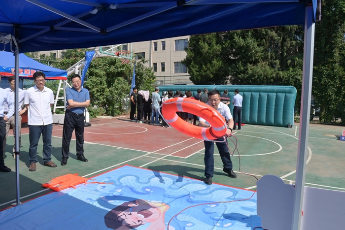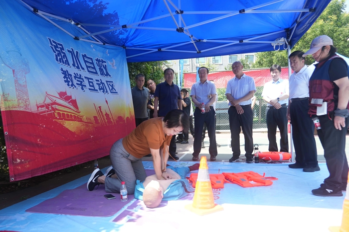 演练结束后,举办方在大厦篮球场开启安全咨询体验活动。整个活动共设置了6个项目,分别为拥挤踩踏应急处置体验区(充气帐篷)、消防隐患排查试验区、电动车电池穿刺爆燃体验装置、溺水自救互救教学培训区、醉酒交通AR模拟体验、安全标志互动区。活动现场气氛热烈,尽管天气炎热,但丝毫没有减弱大家体验掌握应急技能的热情。