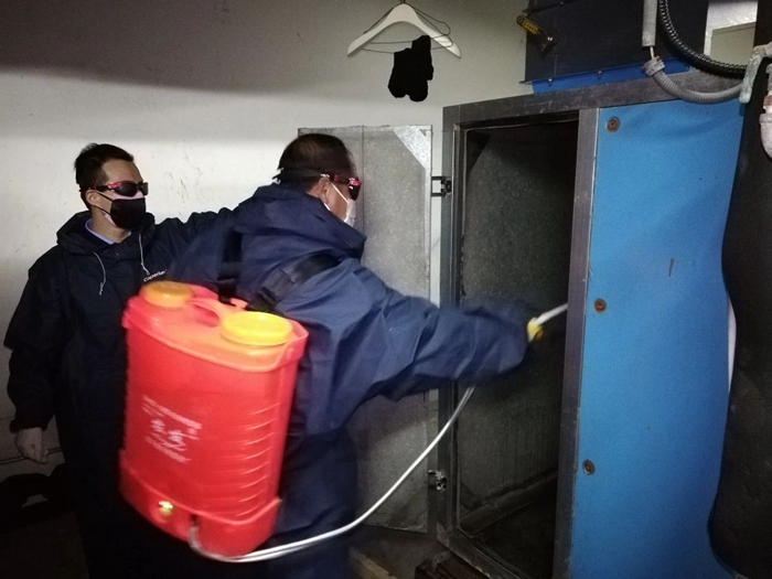 在大厦大堂,公司党总支书记、总经理、副总经理、运营总监现场协调指导,及时与公司办公室沟通物资供应,事业部班子成员现场指挥调度,中控操作、楼内保洁消毒、空调消毒、客户服务等各方面工作紧张有序推进。