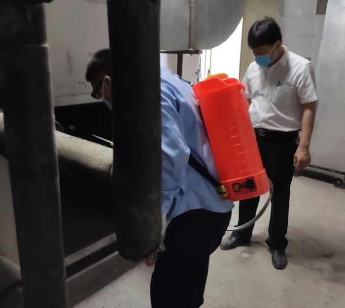 工作人员对华腾新天地商场新风机组进行消杀作业