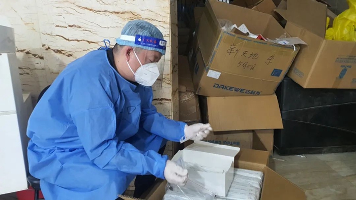 不等社区同志手把手教,我就掌握了穿脱防护服、84消毒液配比等工作的方法,又经现场紧急培训学习了维持秩序、身份信息登记、开箱封箱等方法。很快我就上手开始了紧张而忙碌的工作。