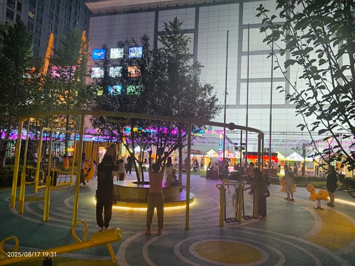 夏日傍晚,位于东四环的华腾新天地商场前,缤纷夜市+休闲广场,周边居民享受着夏日晚间的热闹缤纷与闲暇舒适。